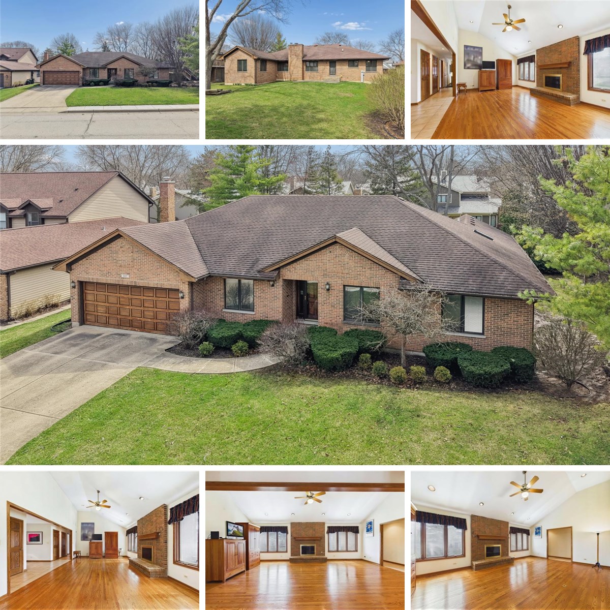 Stately all-brick ranch in one of Libertyville's most desirable neighborhoods! This spacious home offers over 2,200 square feet above grade plus a finished basement, creating incredible space for everyday living and entertaining. A welcoming foyer leads to an expansive family room featuring soaring vaulted ceilings, rich hardwood floors, recessed lighting, and a striking brick fireplace flanked by oversized windows. The large eat-in kitchen offers abundant cabinet and counter space, a center island, pantry, hardwood floors, and room for a full-sized table. A formal dining room is ideal for hosting holidays and gatherings. The primary suite is privately tucked away and features a generous walk-in closet and large ensuite bath with dual vanities. Two additional main-floor bedrooms and a full hall bath provide comfortable space for family or guests. The finished basement adds tremendous flexibility with a huge recreation room, fourth bedroom, full bath, office, and extensive storage space. Enjoy the convenience of a main-floor laundry room, attached 2-car garage, and low-maintenance brick exterior. The backyard offers a patio and open green space perfect for relaxing or entertaining. Ideally located close to Libertyville's vibrant downtown, Metra, parks, restaurants, shopping, and easy access to I-94.